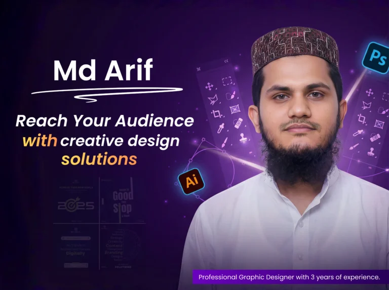 সঠিক ডিজাইনই একটি ব্র্যান্ডকে তার অডিয়েন্সের কাছে পৌঁছে দেয়।আমি ব্র্যান্ডের লক্ষ্য বুঝেকার্যকর, পরিকল্পিত ও ভিজ্যুয়ালি শক্তিশালী ডিজাইন তৈরি করি।আপনার ব্র্যান্ডের জন্য মানসম্মত ডিজাইন সল্যুশনের জন্য যোগাযোগ করুন।